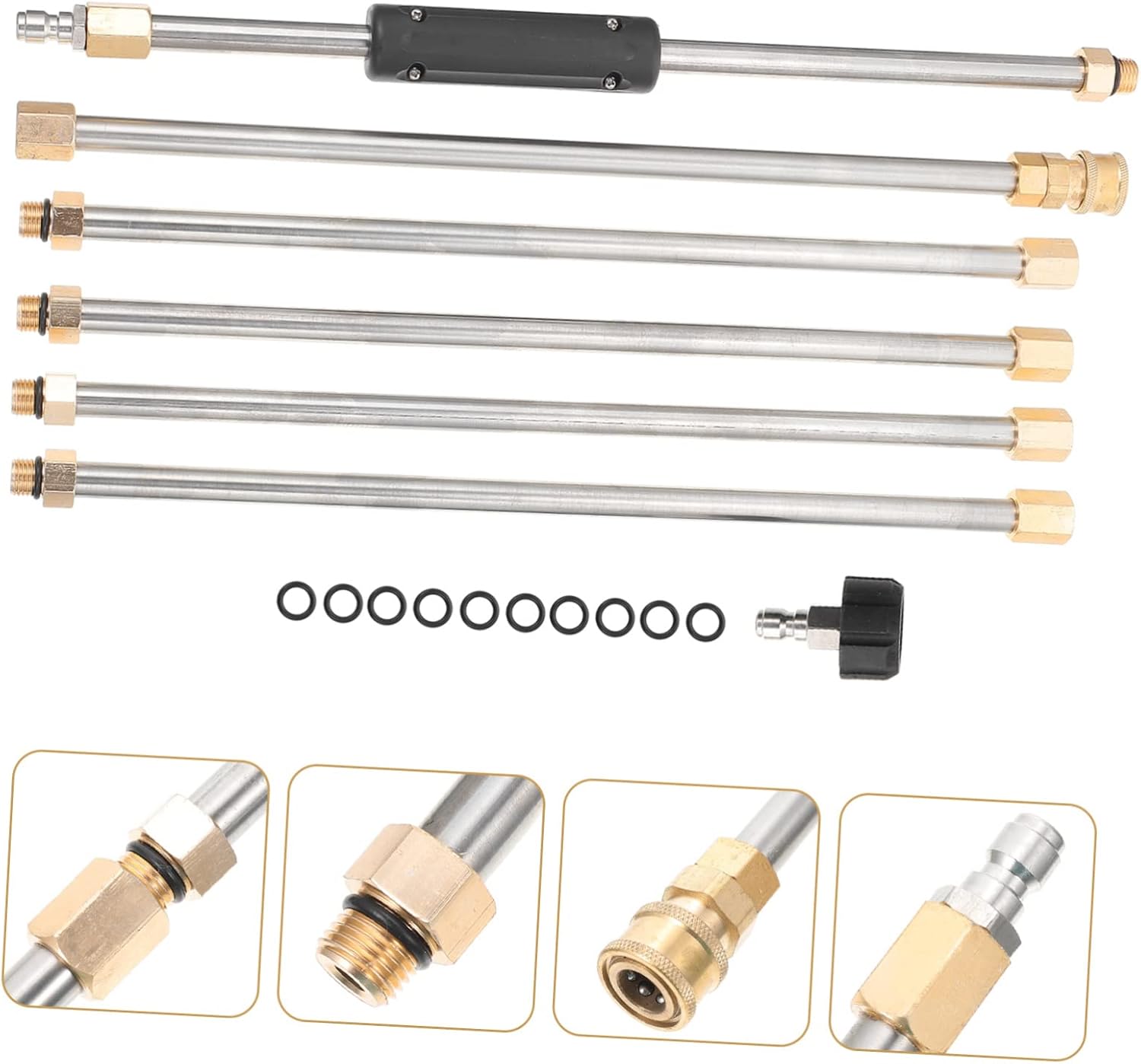 Package List 6 x extension rods 1 x nozzle 10 x sealing rings Characteristics -Color: Silver high pressure washer extension wand -Material: Stainless steel, rubber, copper Pressure Washer Extension Stick -Package Size: About 41.00x8.00x6.00cm/16.14x3.15x2.36in sprayer extension rod -Features with simple structure, which offers you convenient installation pressure washer extension lance. -A perfect housewarming present for your friends, showing your love and care pressure washer extension wand. -Adopts precision production to enhances the stable characteristics and high reliability pressure washer extension adapter. -One-piece molding, smooth lines, can be well adapted to the car washing machine pressure washer pressure washing accessories. -It can also be used outside, such as driveway, walkway, deck, roof and your car, etc power washing extender.Goods DescriptionHigh Pressure Washer Tool It is easy to install and disassemble, which will to your work.pressure washer extension lance Portable pressure washer extension tool wand, which can better meet your needs and provide for your .Washing Lengthening Rod It has a wide range of uses and can be well applied to car washing and floor washing